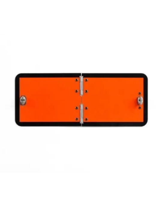 Hazchem ADR plate for front of an ADR vehicle. Acceptable for the front of an ADR vehicle only where there is insufficient space for a large panel. Easily secured either open or closed by a simple turn button. Aluminium construction to obviate rust. Reflective orange with black border. Small aluminium folding reflective orange with black border Hazchem sign with vertical fold 300 x 120mm. Only suitable if there is insufficient area to affix a larger plate. (Standard 400 x 300mm size reference: VS004) – ADR product.
